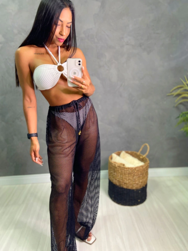 Detalhes: Calça de telinha, cintura alta e cós de elástico ou cordão.