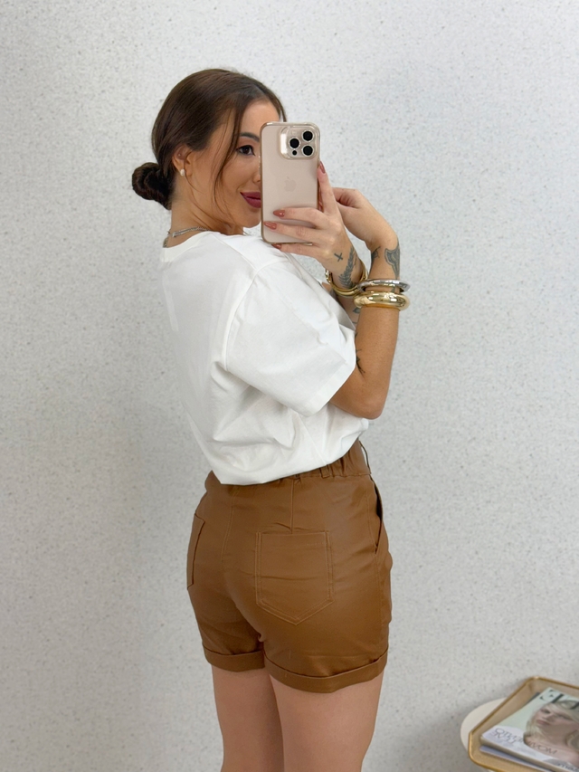 Esse short resinado é a peça perfeita para quem busca estilo e conforto em um só look. Com um acabamento sofisticado que imita o couro, ele traz um toque moderno e despojado para diversas produções.