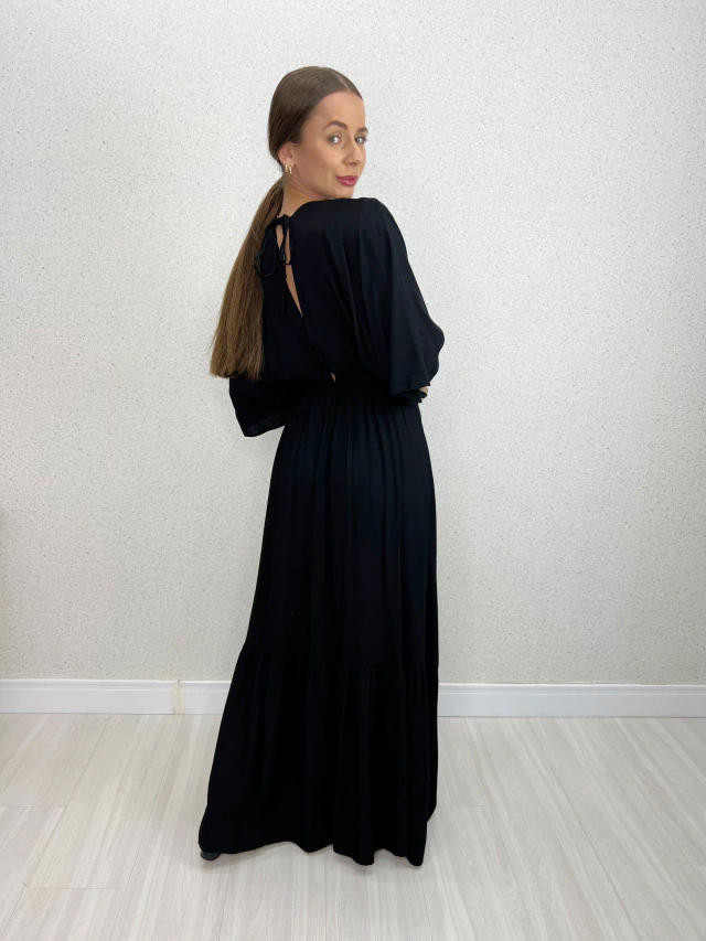 Este elegante vestido combina conforto e sofisticação em um design versátil. Com mangas médias que proporcionam um toque refinado, o modelo apresenta um charmoso decote em V que valoriza o colo.
