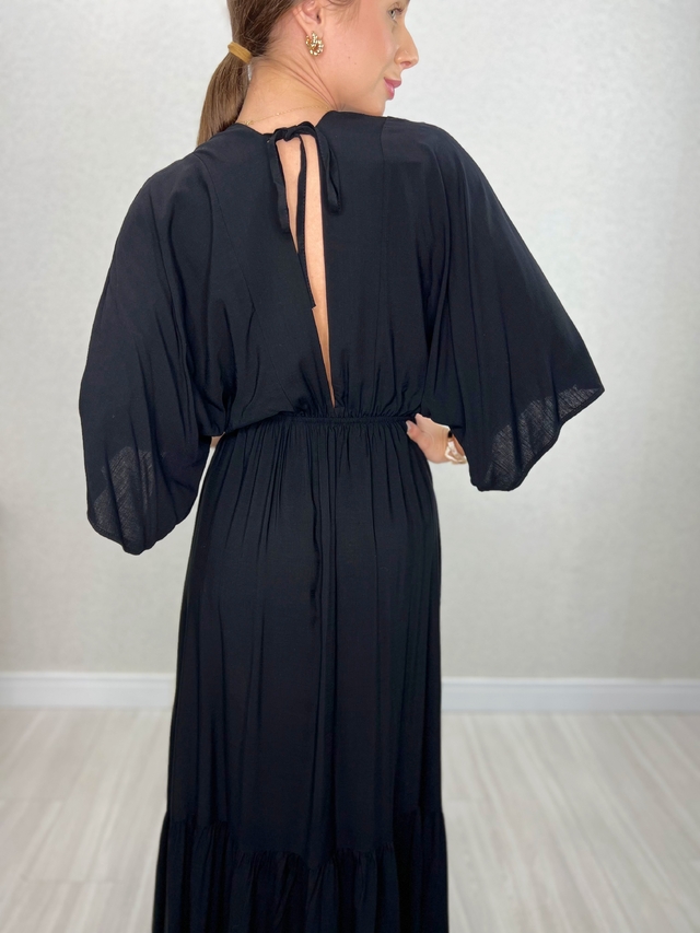 Este elegante vestido combina conforto e sofisticação em um design versátil. Com mangas médias que proporcionam um toque refinado, o modelo apresenta um charmoso decote em V que valoriza o colo.